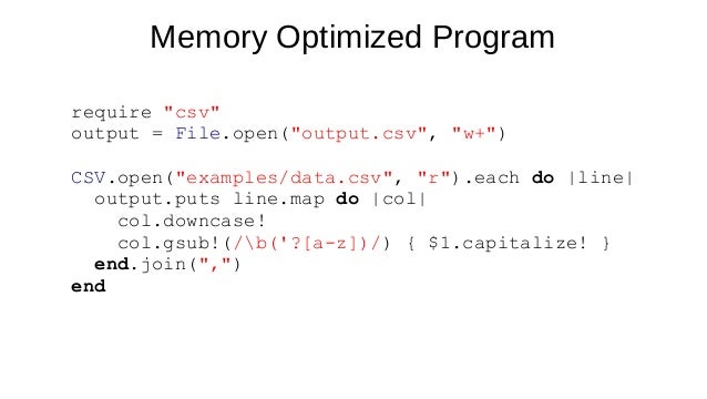 Ruby provides CSV support in the Standard Library and it will help us do most of the job very quickly;. It opens the file for write mode. I just created a Ruby script that would open, read, and parse a simple CSV file.