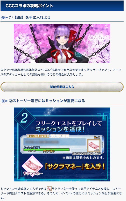 アキバ総研ついに「Fate/EXTRA CCC」とのコラボイベントが復刻されました!イベント「復刻版:深海電脳楽土 SE.RA.PH -Second Ballet-」は、19年2月日. CCCコラボってどんなイベント? ・BBがもらえる ・ミッション形式 ・クリアまでめちゃ長いイベント ・礼装で敵を増加させてミッション達成→次へ進むのがメイン ・難易度は高め ・BBスロットは人類悪 ・フリクエ30個くらいある ・BBがもら…. Cccコラボ、シナリオも音楽もとても良かったから、かなりだるかったミッションも許す — 兎鱚(ときす) (@tokisu_fgo) February 26, 19 cccコラボどう考えても、シナリオを人質に取られてるから走らざるを得ないというのがなんともこのやろう.